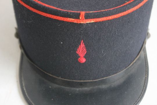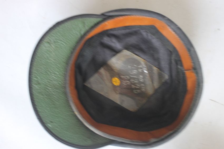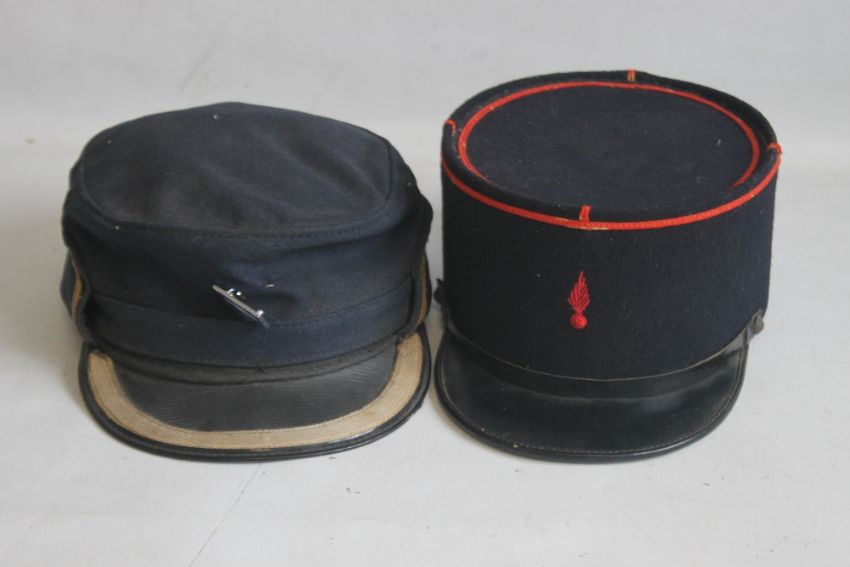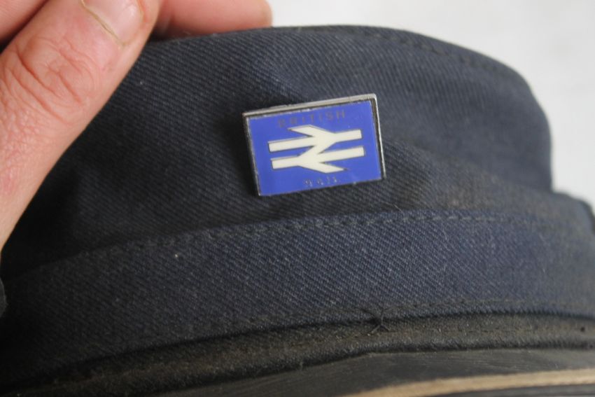A VINTAGE BRITISH RAIL CAP WITH BLUE BADGE, and a vintage French fireman's cap