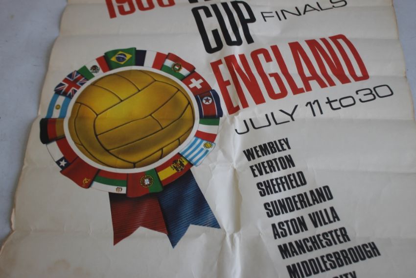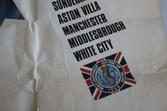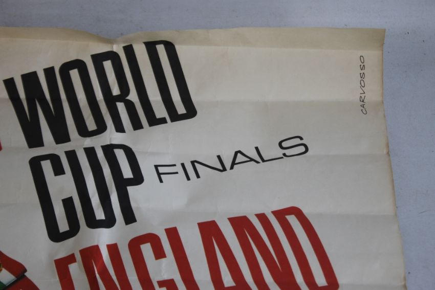 1966 WORLD CUP FINALS, ENGLAND JULY 11 TO 30 PAPER POSTER BY CARVOSSO, printed by McCorquodale & Co. Ltd, London, 50 x 75 cm¦Condition Report:Well worn, the paper yellowing, numerous folds from storage, edge chips, tear to bottom central area¦