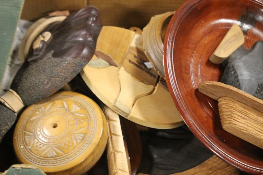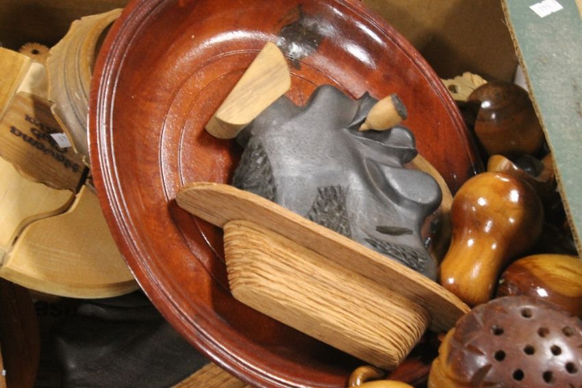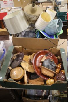 A TRAY OF TREEN TOGETHER WITH A TRAY OF ELECTRICALS TO INCLUDE LAMPS (trays not included)