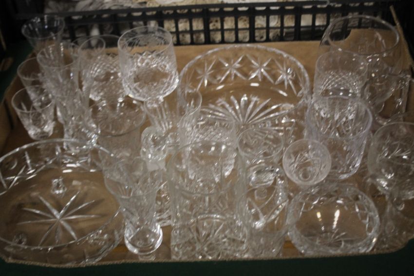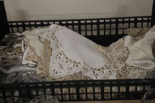 A TRAY OF GLASSWARE TOGETHER WITH A TRAY OF LINEN (trays not included)
