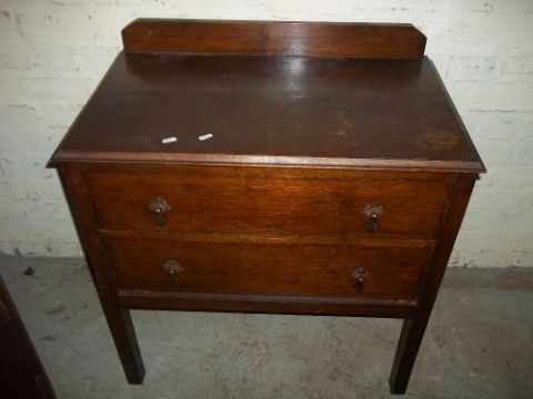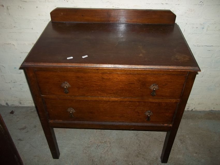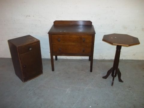 AN OAK ANTIQUE TWO DRAWER CHEST, A BEDSIDE CUPBOARD AND A PEDESTAL SIDE TABLE