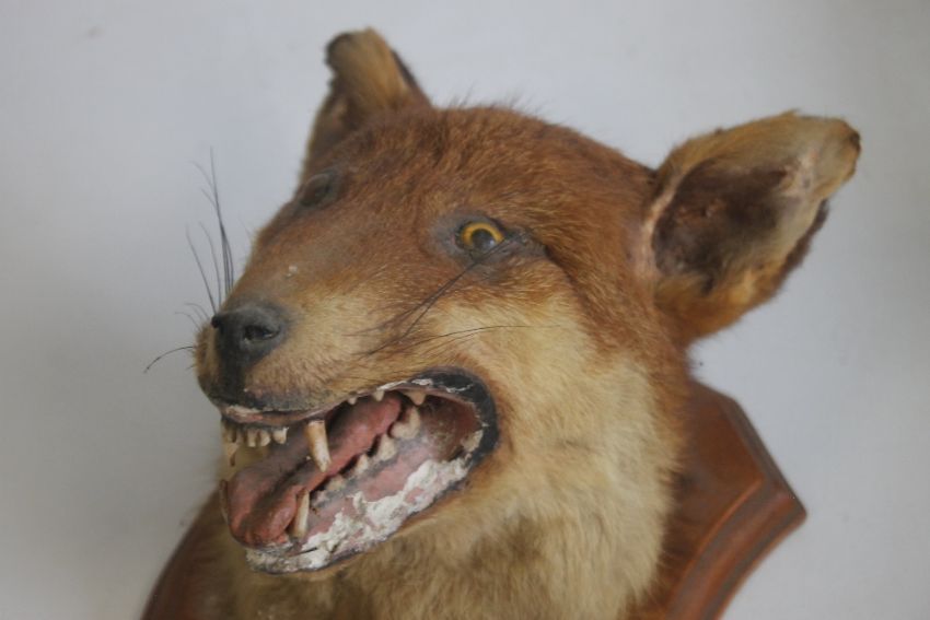 A MOUNTED TAXIDERMY FOX HEAD