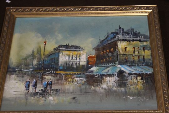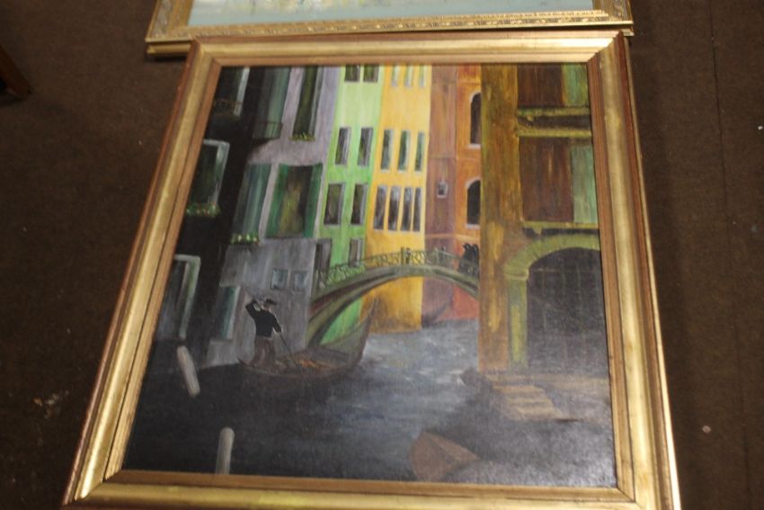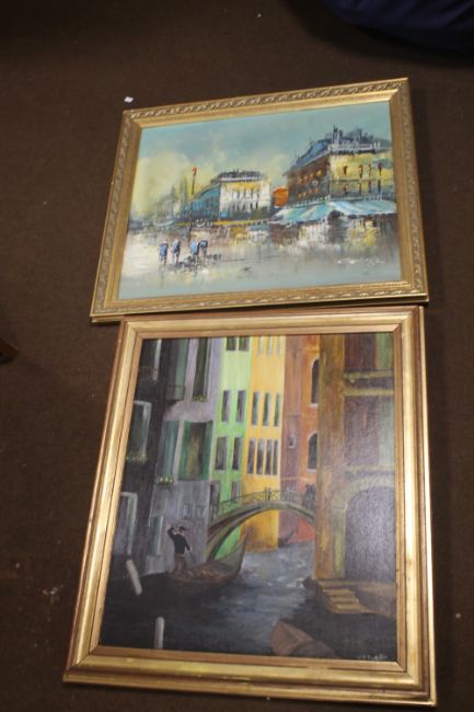 A FRAMED VENETIAN TYPE CANAL SCENE, together with a continental city scene