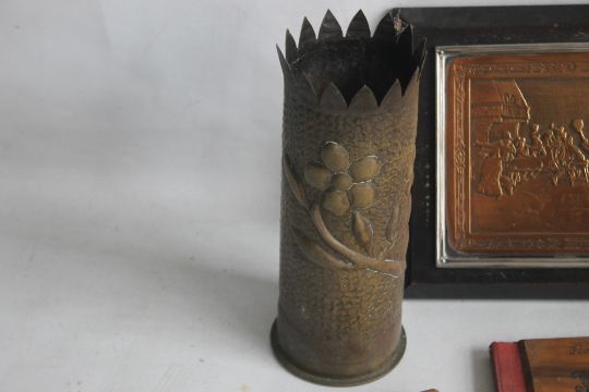 A SMALL BOX OF COLLECTABLES to include a shell case vase, a copper warmer, a framed metal plaque titled "Joyeuse Auberge" and a "Jerusalem" wood covered New Testament, and a "Jerusalem" wood covered wild flower souvenir book.