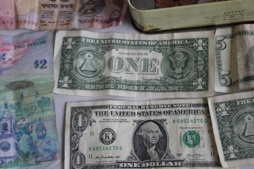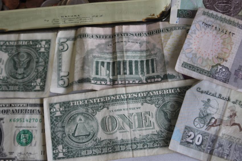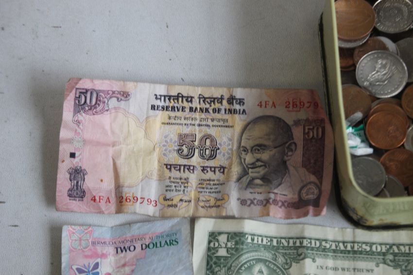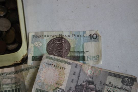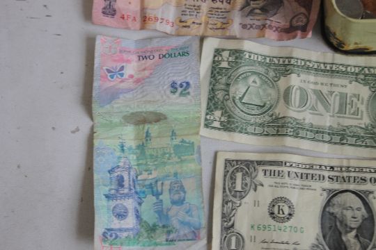 A TIN OF WORLD COINS TO INCLUDE A QUANTITY OF EUROS, together with a small collection of bank notes including U.S dollars