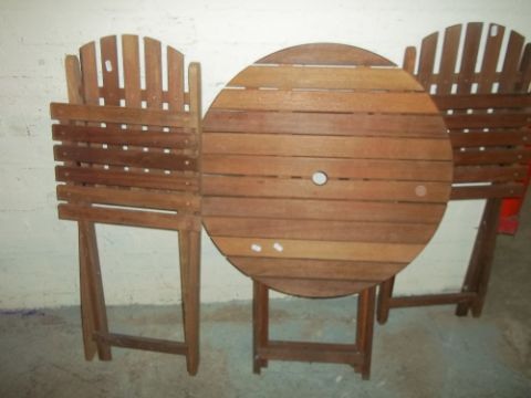 A WOODEN FOLDING PATIO TABLE SET WITH TWO CHAIRS
