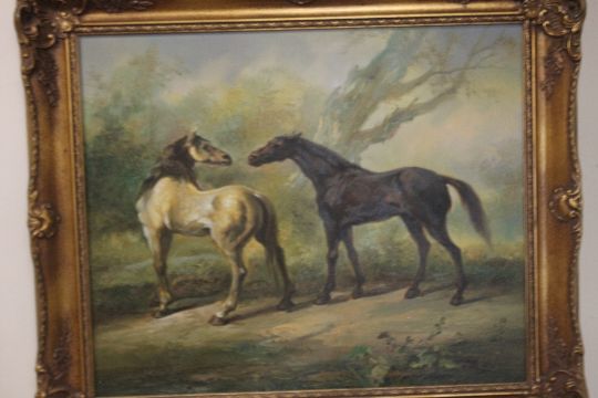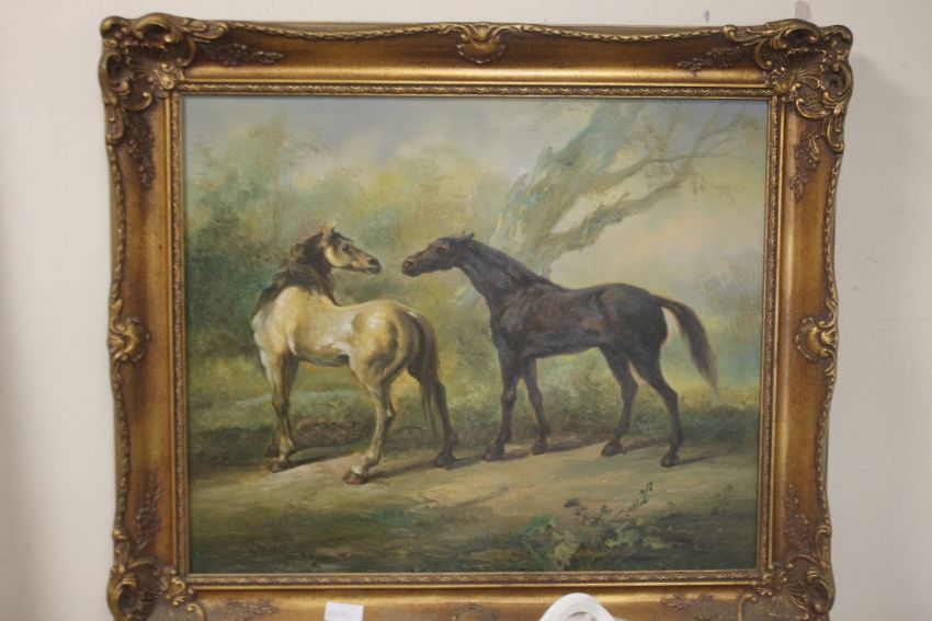 A FRAMED OIL DEPICTING HORSES, signature indistinct