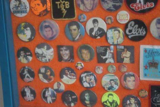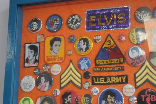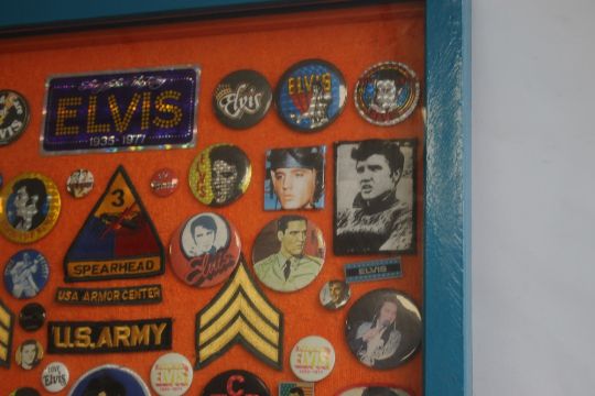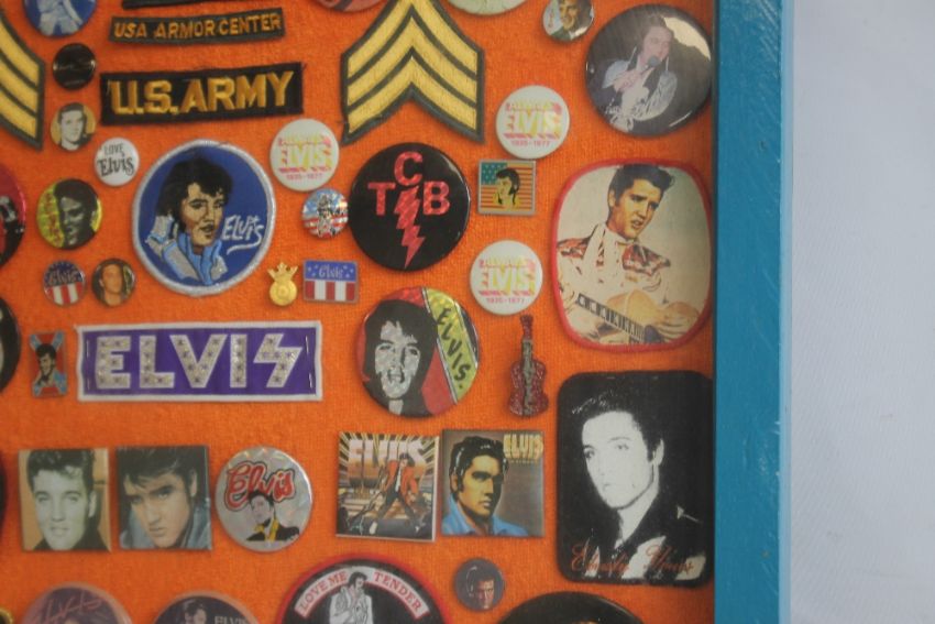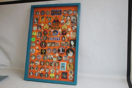 A FRAMED COLLECTION OF CIRCA 130 ELVIS PRESLEY PIN AND CLOTH BADGES, 96 cm x 66 cm