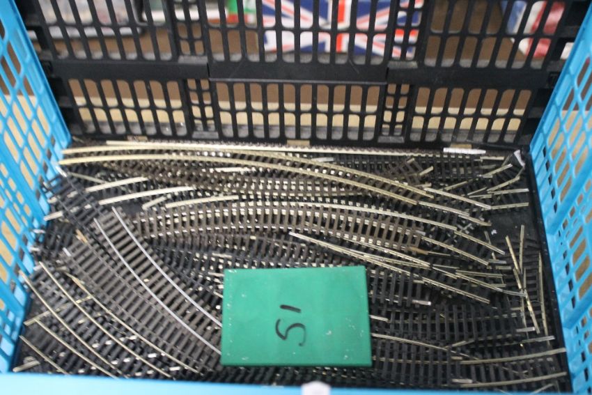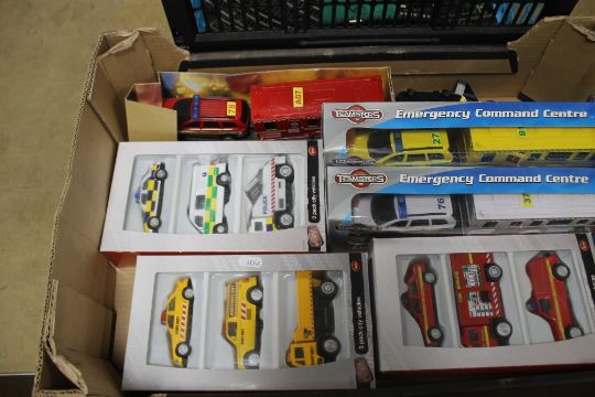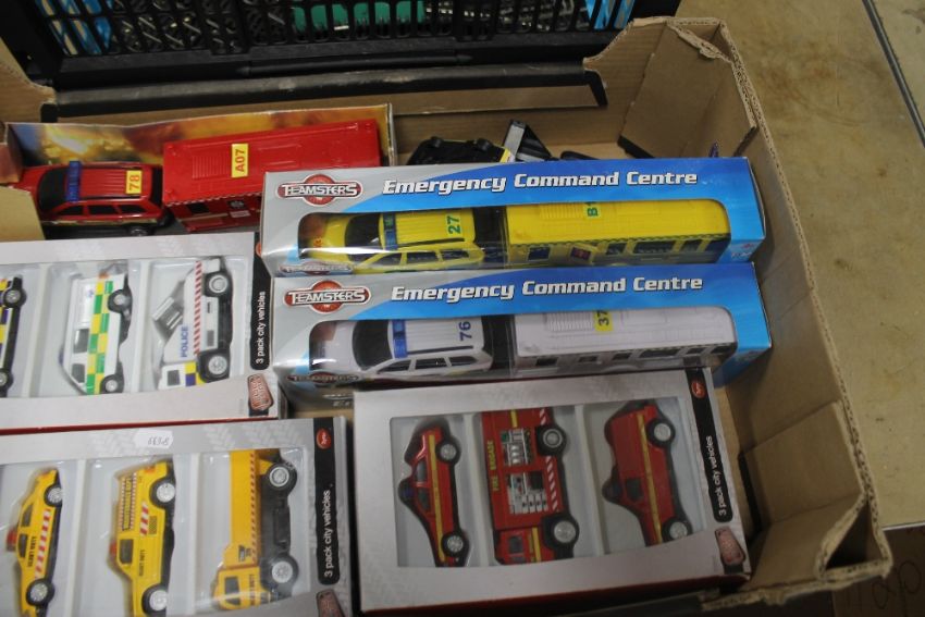 A BOX OF OO GAUGE TRACK BY HORNBY AND MAINLINE to include straights, bends and points together with a quantity of boxed loose diecast and plastic vehicle sets including a fire brigade set, emergency vehicle sets, heavy duty set etc.