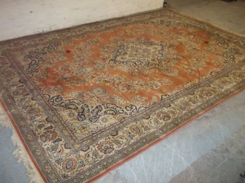 A LARGE RUG AND AN ANTIQUE FOOTSTOOL, size of rug 3.7 x 2.5 m