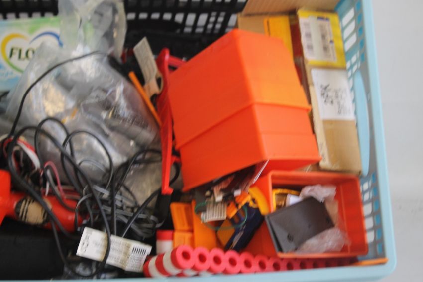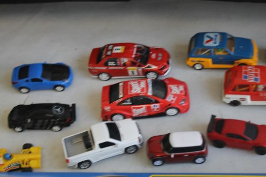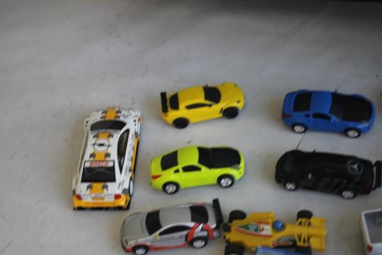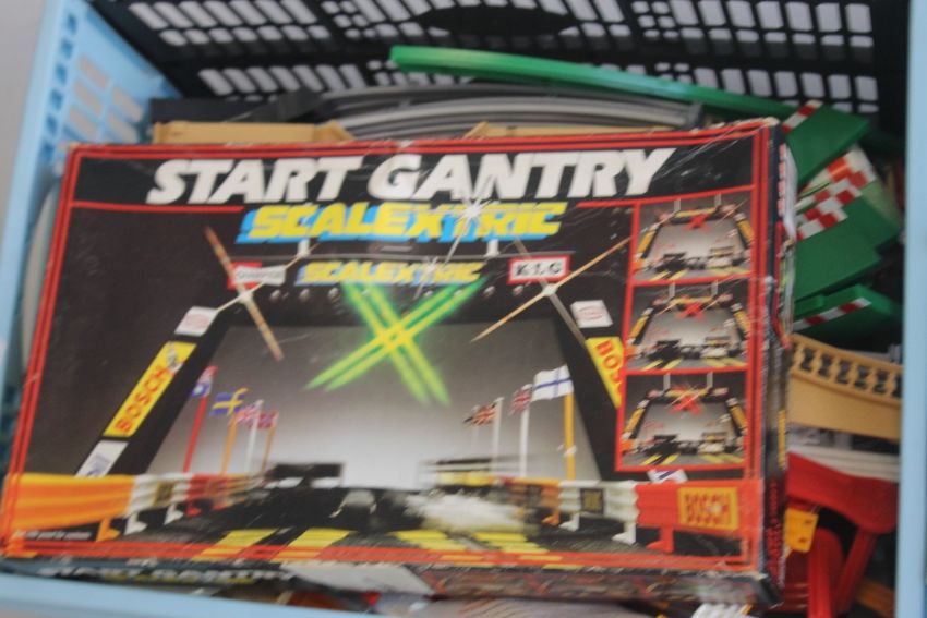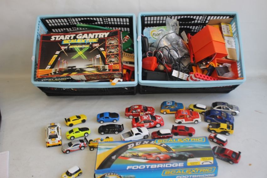 A COLLECTION OF TWENTY ONE SCALEXTRIC SLOT CARS BY HORNBY, SCALEXTRIC ETC., boxed Scalextric footbridge, boxed Scalextric start gantry together with two boxes of mixed Scalextric items including track edges, barriers, flags, hand controls, transformer etc.