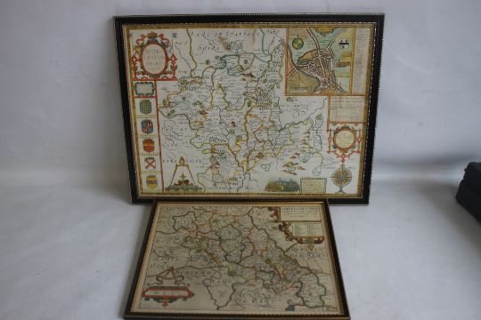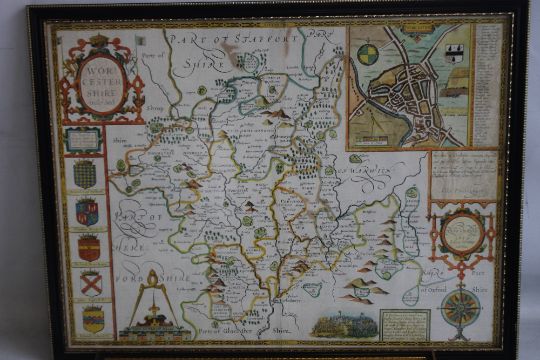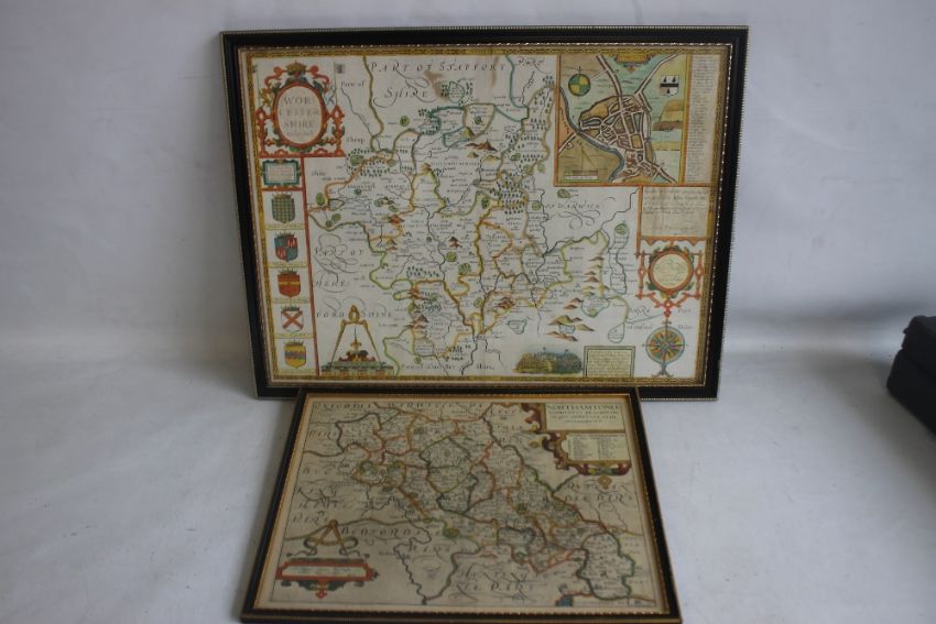 JOHN SPEED MAP OF WORCESTERSHIRE c.1676, with later hand colouring, possibly laid down but not inspected out of frame 43 x 56 cm (inc. frame) together with a Saxton Kip map of Northamptonshire c.1610, 32 x 40 cm (inc. frame) (2)