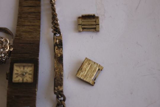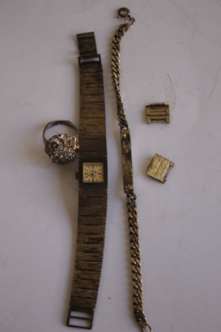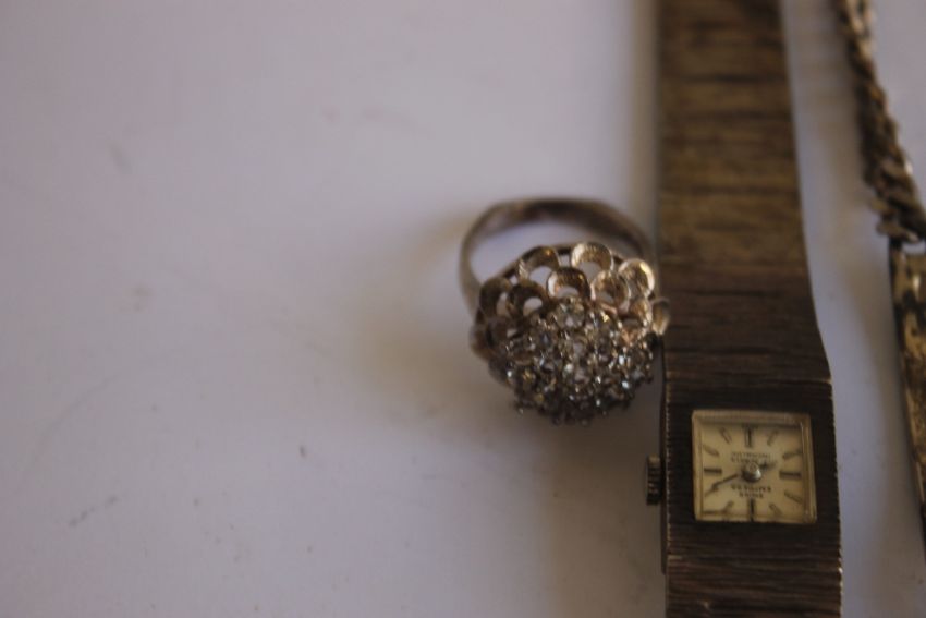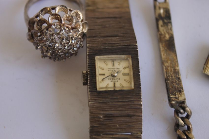 A VINTAGE HALLMARKED SILVER LADIES "SWISS EMPRESS" BRACELET WRIST WATCH, and spare links, along with a silver ring and an identity bracelet,