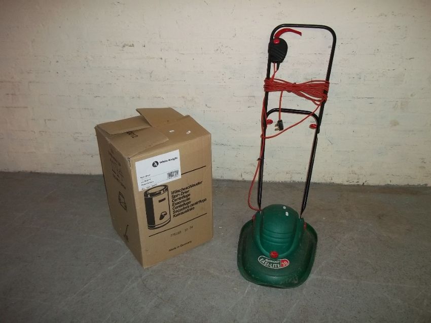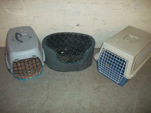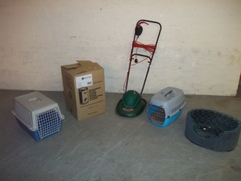 THREE CAT BEDS/CAGES, ONE NEW BOXED SPINNER AND A HOVER MOWER