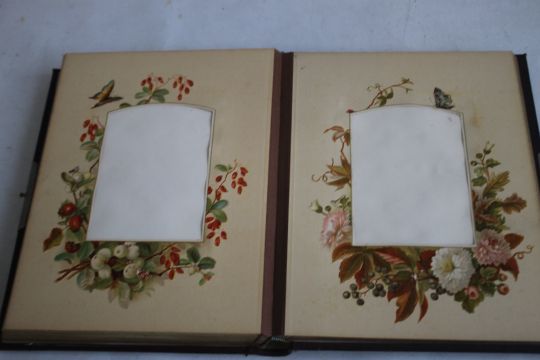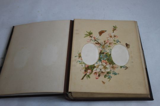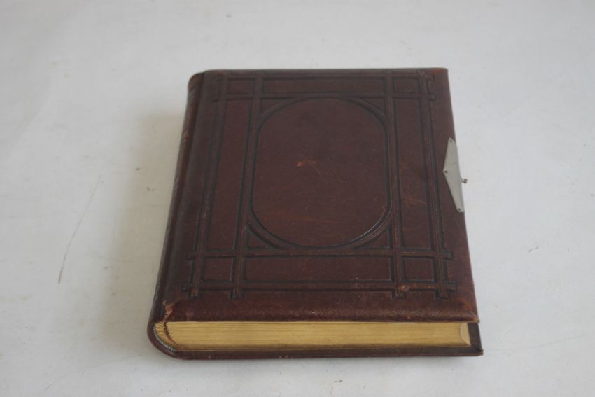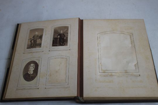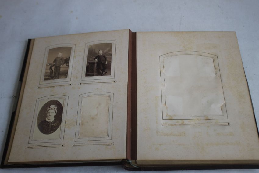 A VICTORIAN LEATHER BOUND PHOTOGRAPH ALBUM WITH CONTENTS, mainly portraits some decorated pages