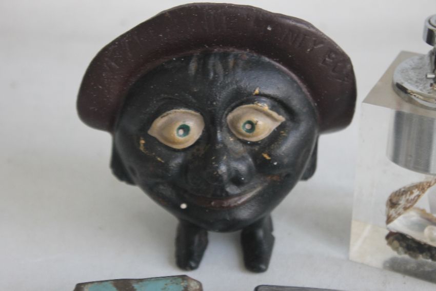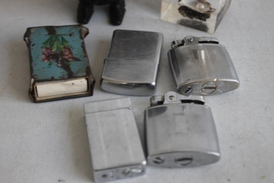 A VINTAGE SAVE AND SMILE MONEY BOX, and a quantity of cigarette lighters