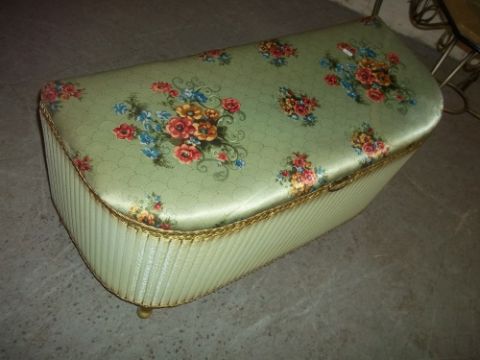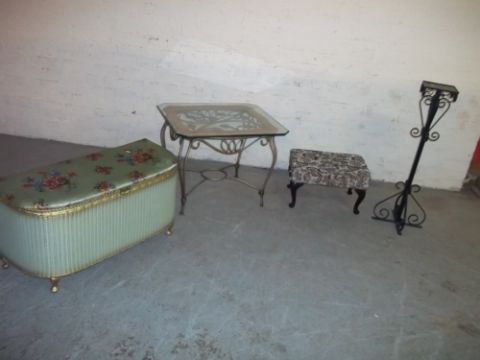 A WICKER KRAFT LOOM STYLE BLANKET CHEST, A FOOTSTOOL, A GLASS SIDE TABLE, A WROUGHT IRON STAND AND TWO SPEAKER STANDS (6)