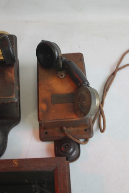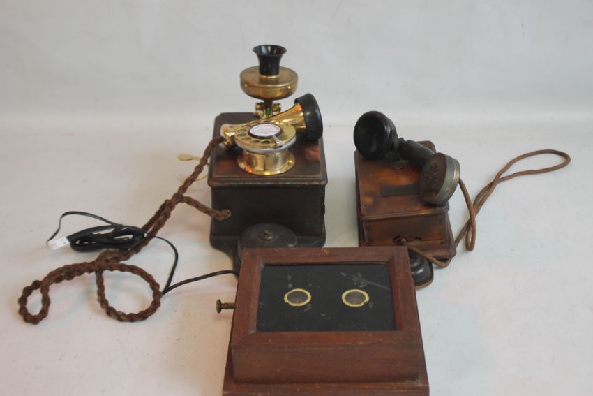 A VINTAGE FRENCH TELEPHONE, A WALL MOUNTED PHONE 1920S STYLE also including original box converted together with a vintage butler's bell (3)