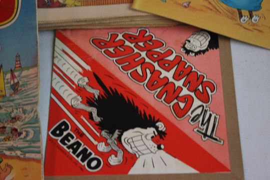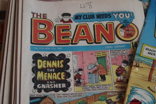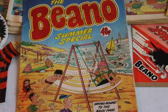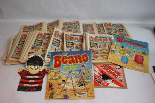 BEANO COMICS WITH TWO FREE GIFTS, approx. 100 1980s Beano comics with two Summer Specials and a 'Gnasher Snapper' and a 'Dennis The Menace' / 'Gnasher' glove puppet
