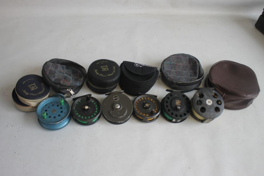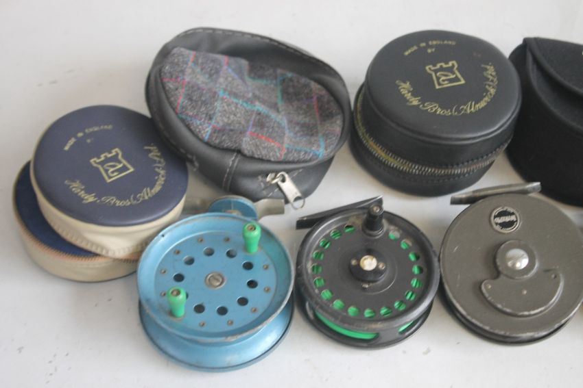 A COLLECTION OF FLY REELS to include "Intrepid," a vintage scout 8-80 etc (6) together with a a quantity of empty reel cases