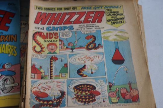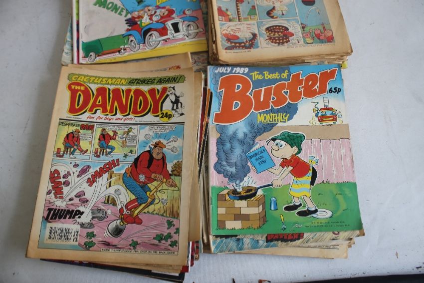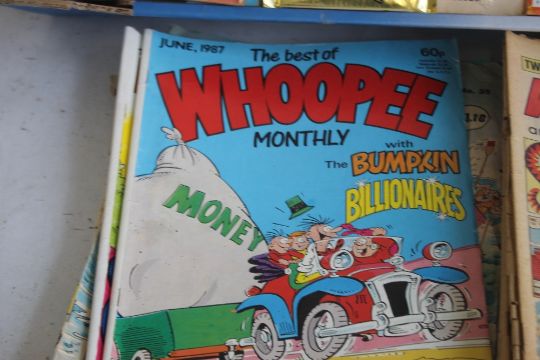 TWO BOXES OF MISCELLANEOUS COMICS to include Beano, Dandy, Buster, Whoopee, Whizzer and Chips, Marvel Treasury Editions, etc. some A/F together with an unopened packet of 10 Hildebrandt Brothers 1994 Marvel Masterpieces trading cards
