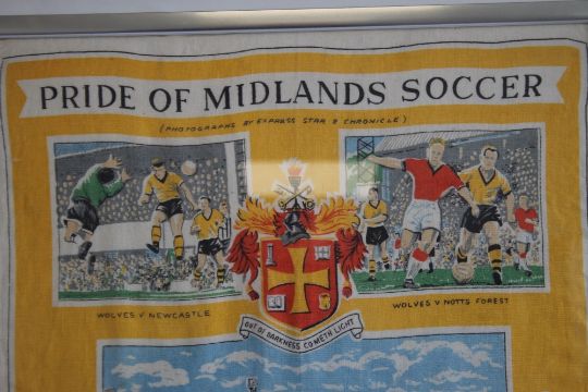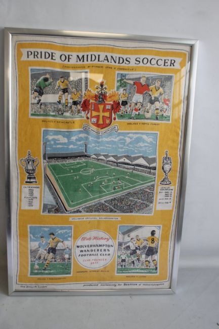 WOLVERHAMPTON WANDERERS - A FRAMED TEA TOWEL "Pride of Midlands Soccer" produced exclusively for Beatties of Wolverhampton circa 1960, it features images from the Express & Star & Chronicle 79 x 53.5 cm including frame