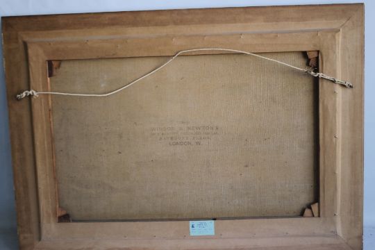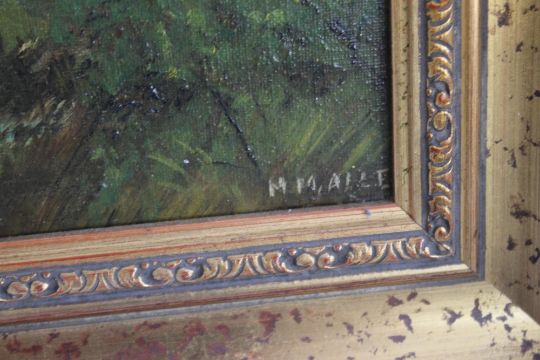 A LARGE FRAMED OIL ON CANVAS OF A LAKESIDE SCENE, signed "M. Allen" 62 x 68 cm