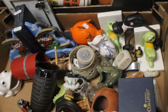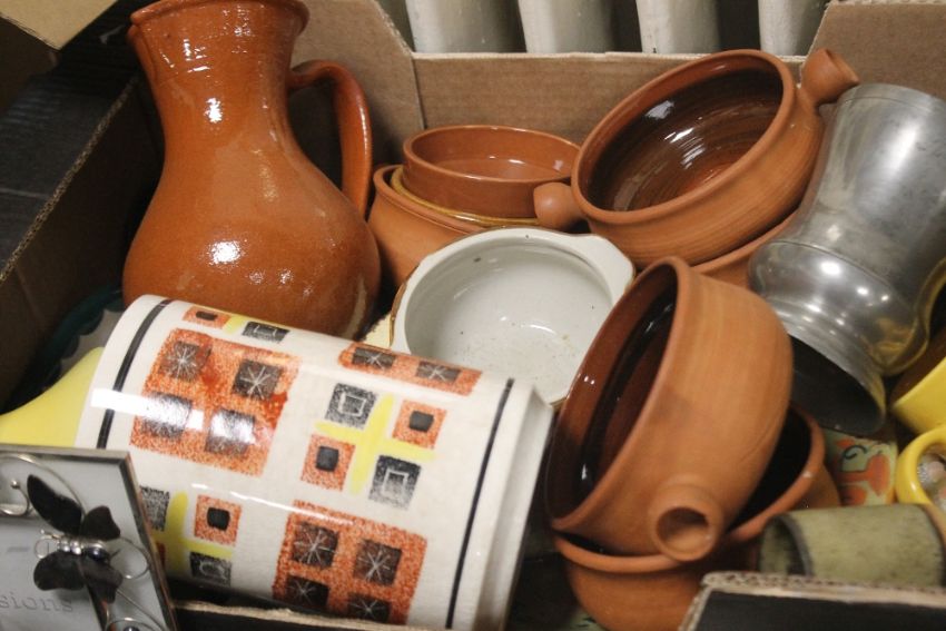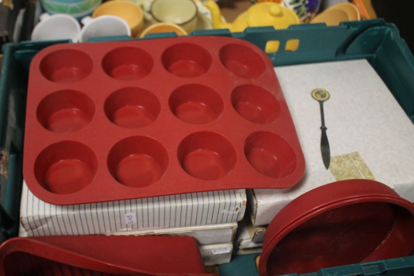 FOUR TRAYS OF CERAMICS AND SUNDRIES to include rubber cake trays (trays not included)