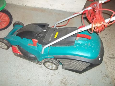 A BOSCH ELECTRIC MOWER AND A WHEELBARROW