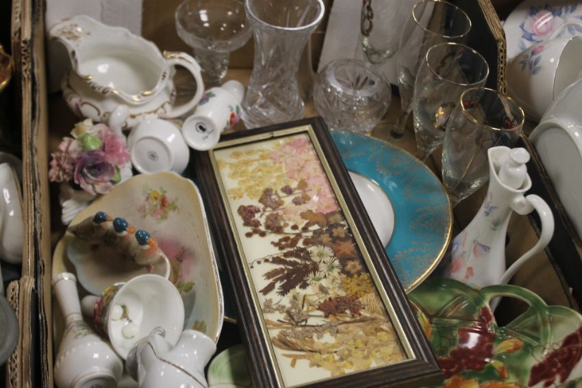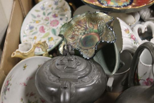 TWO TRAYS OF CERAMICS AND SUNDRIES to include a pewter teapot (trays not included)