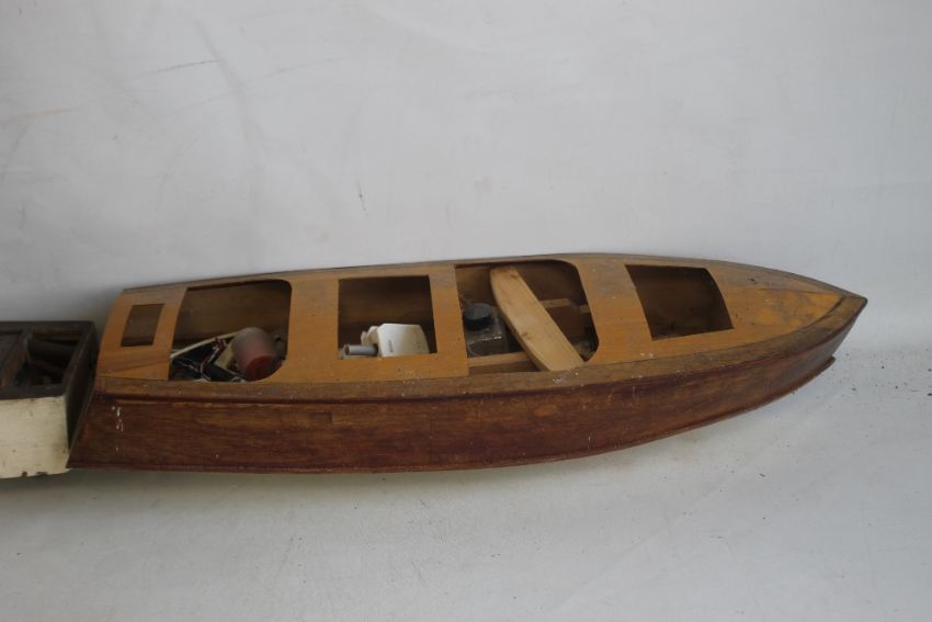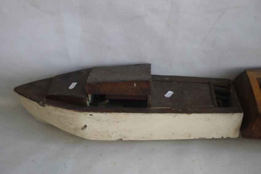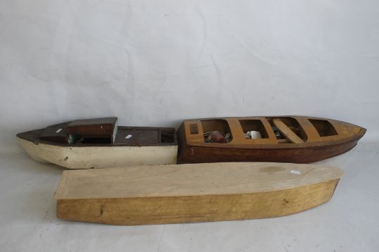 THREE VINTAGE FIBRE GLASS AND WOOD BOATS AND STANDS, 76 cm, 63 cn, and 90 cm