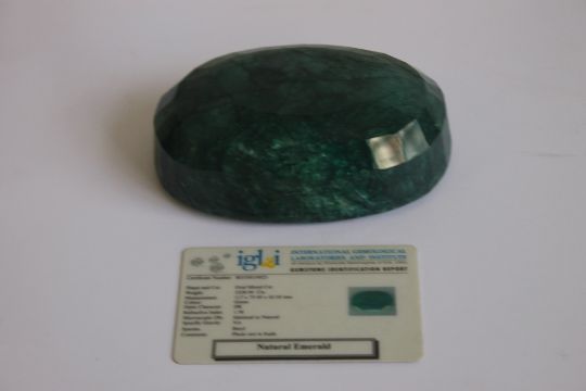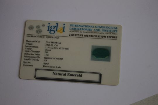 AN IGL & I (INTERNATIONAL GEMOLOGICAL LABORATORIES AND INSTITUTE) CERTIFICATED NATURAL BERYL EMERALD, oval mixed cut, 3228.00 Cts, 117 x 75 x 42 mm in oval box