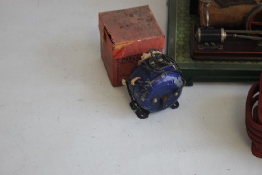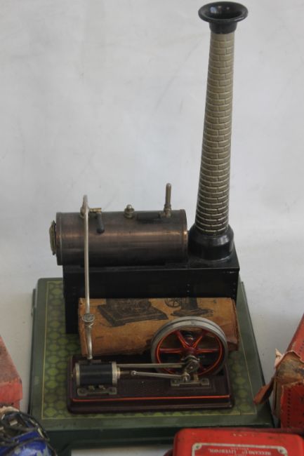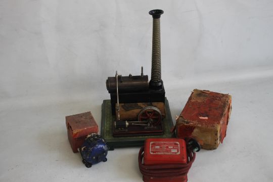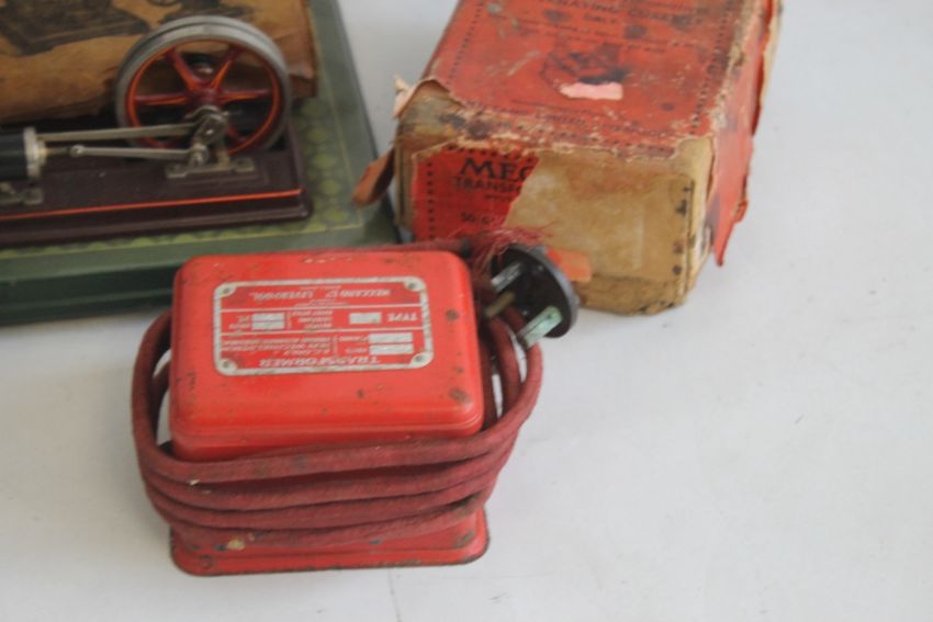 A VINTAGE MODEL DAMPFMASCHINE STEAM ENGINE with fixed cylinder instructions togetherw ith a boxed Meccano transformer and a boxed Meccano electric motor E020 20 volt