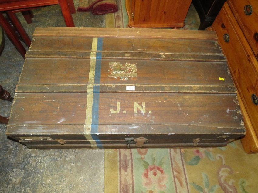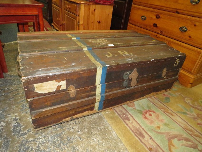 A VINTAGE WOODEN BANDED DOMED TRUNK W-104 CM