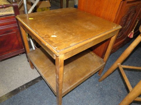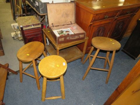 THREE VINTAGE STOOLS, A TWO TIERED OCCASIONAL TABLE AND A SMALL SUITCASE OF VINTAGE KNITTING PATTERNS ETC