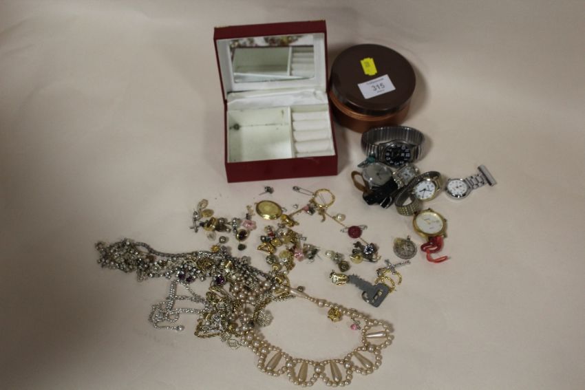TWO SMALL BOXES OF COSTUME JEWELLERY AND WRIST WATCHES