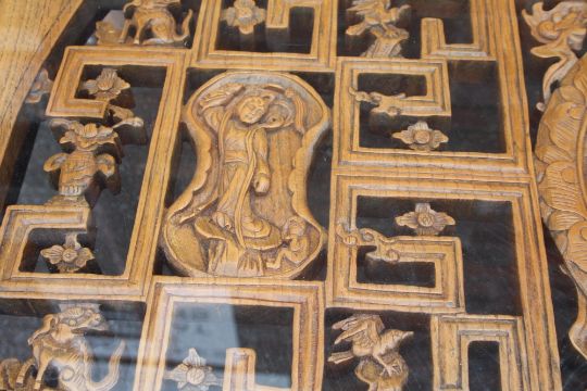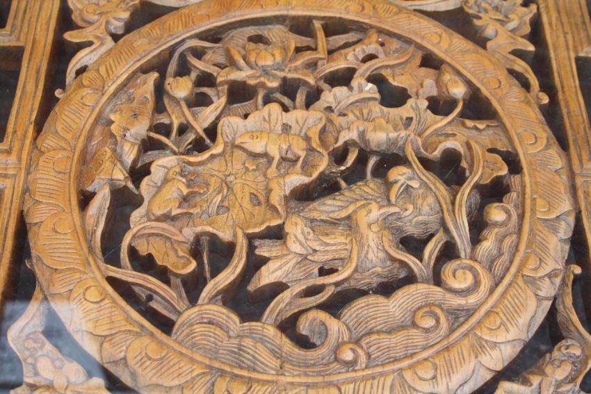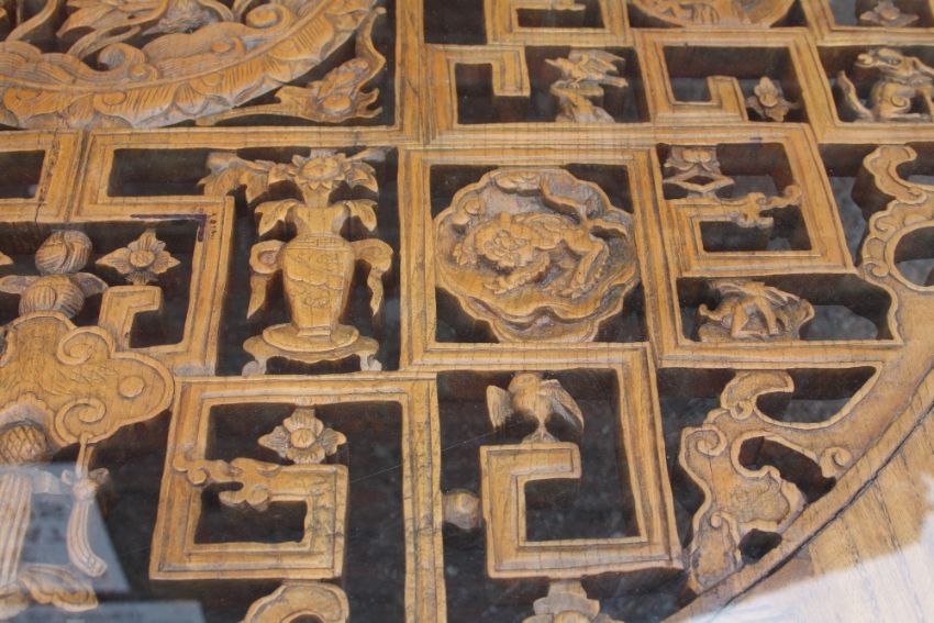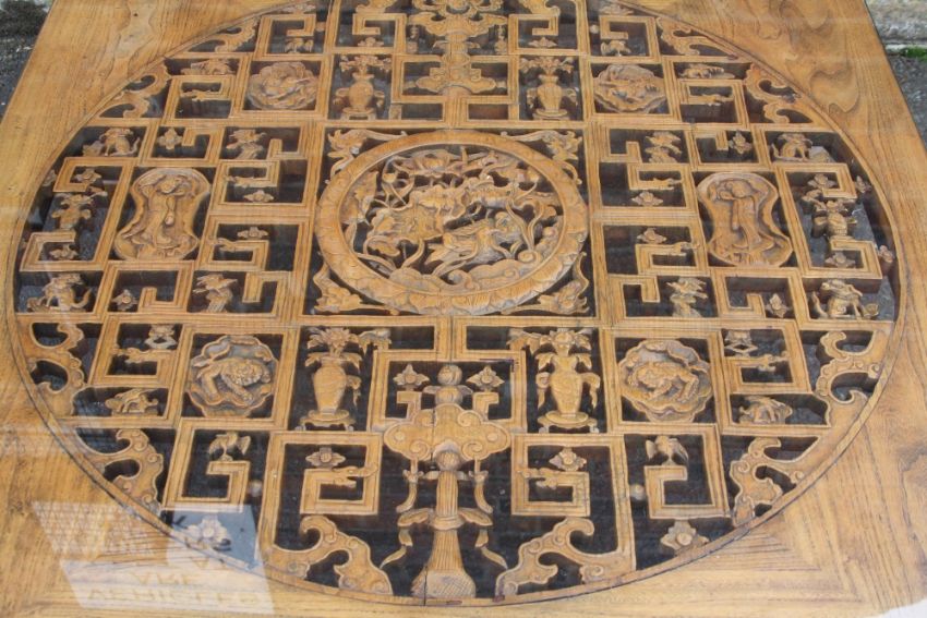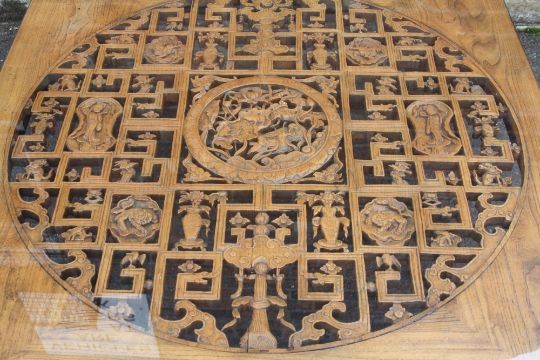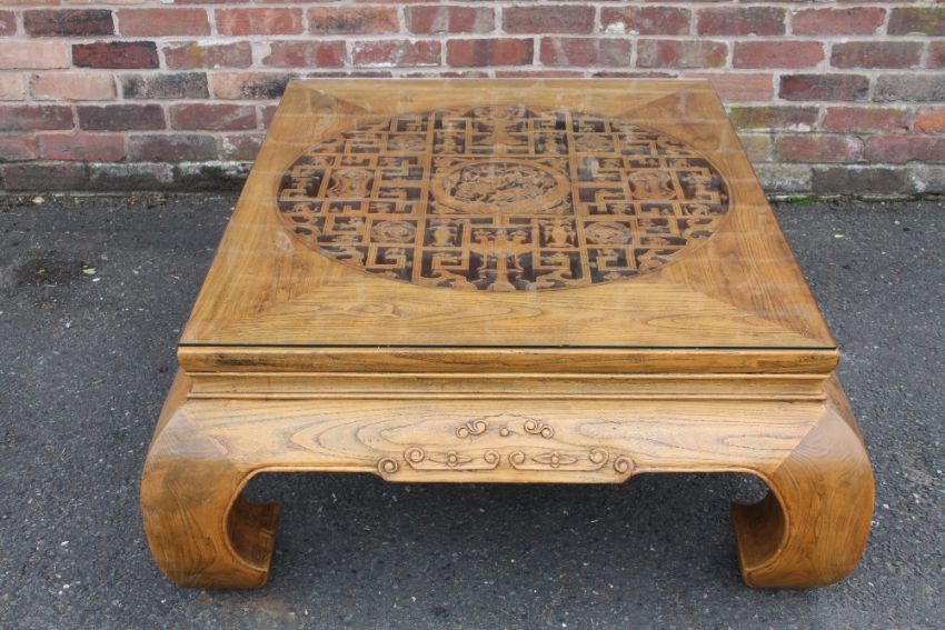A LARGE CHINESE ELM PIERCED AND CARVED LOW TABLE, supported on four heavy scrolling feet, the top with circular carved and pierced detail, with later glass top, H 46, W 112, L 135 cm