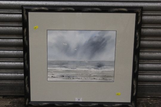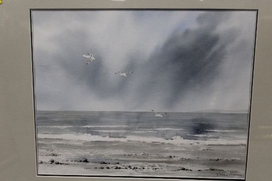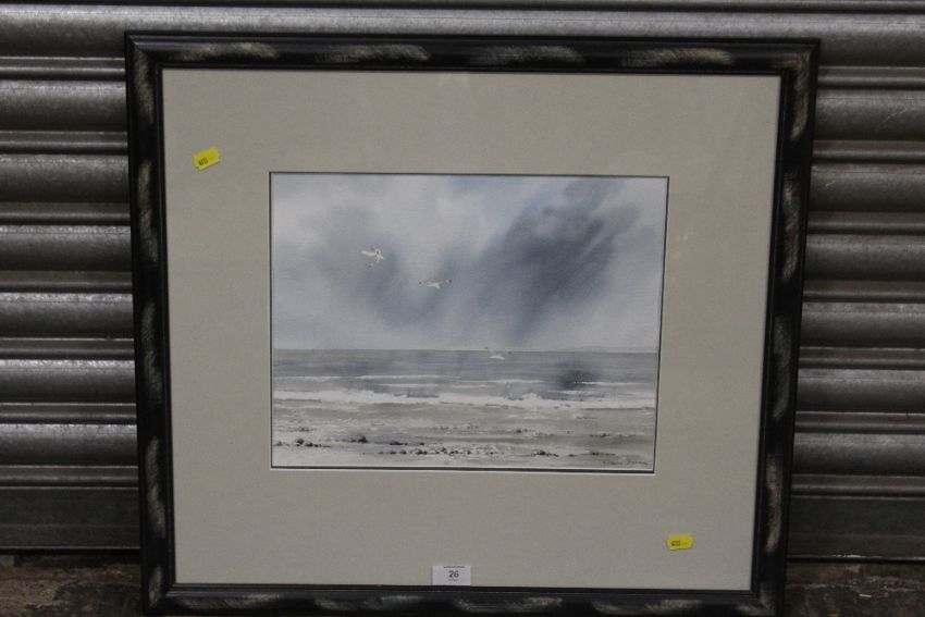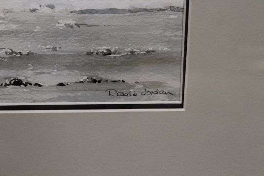 A FRAMED AND GLAZED SIGNED COASTAL SCENE WATERCOLOUR BY ROSALIE JORDAN - OVERALL SIZE 58CM X 63.5CM