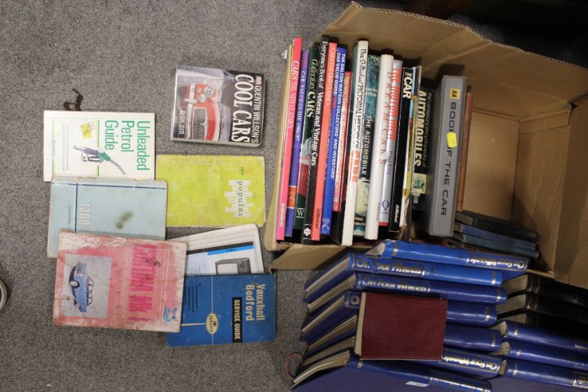 A QUANTITY OF 'ON FOUR WHEELS' MAGAZINES IN BINDERS TOGETHER WITH A TRAY OF CAR/AUTOMOBILE BOOKS