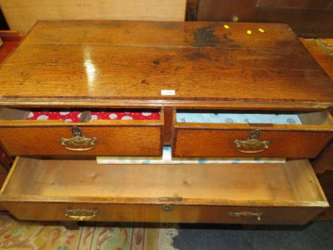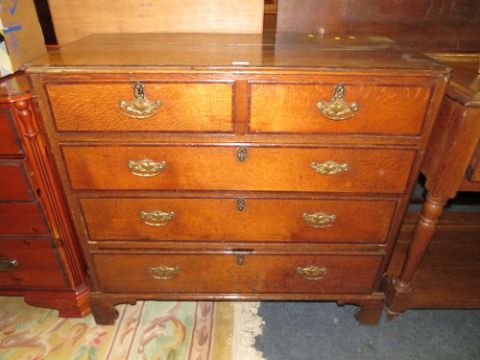 AN ANTIQUE OAK AND MAHOGANY CROSS BANDED FIVE DRAWER CHEST A/F - W 107 cm