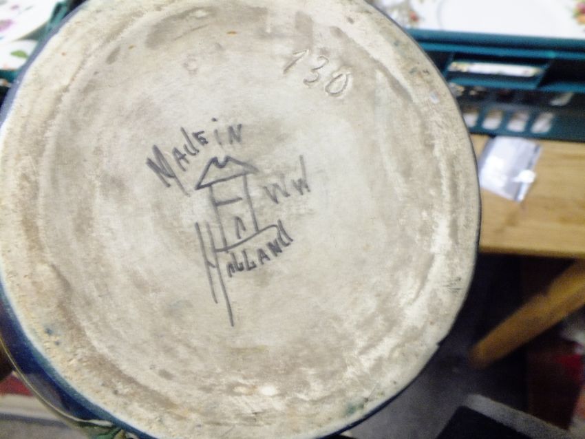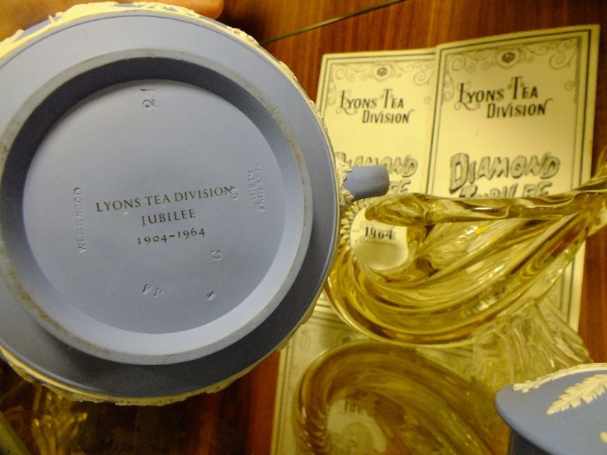 A LARGE TWIN HANDLED DUTCH VASE TOGETHER WITH A LYONS DIAMOND JUBILEE LIMITED EDITION WEDGWOOD JASPERWARE TEAPOT PLUS MENUS, TOGETHER WITH A GLASS VASE