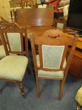 AN EDWARDIAN OAK EXTENDING DINING TABLE WITH ONE LEAF TOGETHER WITH FOUR CARVED OAK CHAIRS