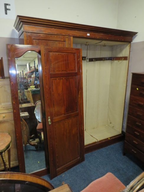 AN EDWARDIAN MAHOGANY INLAID TRIPLE WARDROBE WITH MIRROR H-208 CM W-188 CM