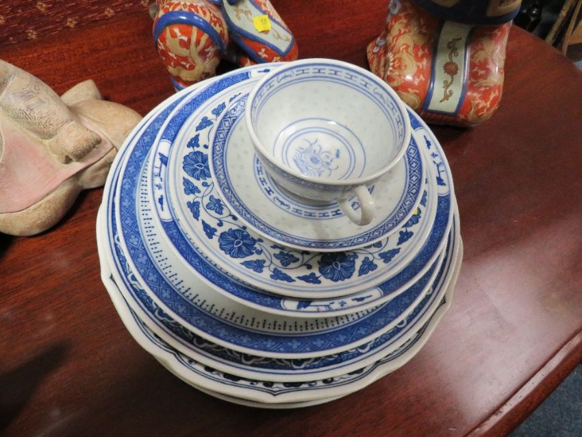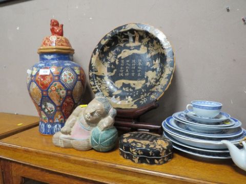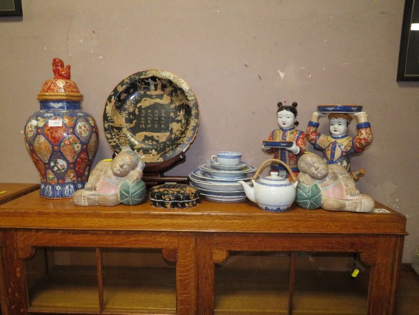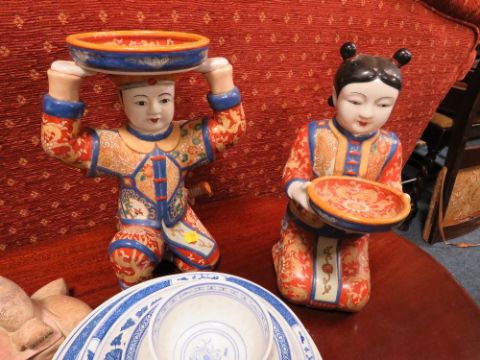 TWO MODERN CHINESE/ ORIENTAL HAND PAINTED FIGURES HOLDING BOWLS WITH ORANGE BACK STAMPS TALLEST HEIGHT -33CM, A LARGE MODERN CHINESE / ORIENTAL HAND PAINTED OCTAGONAL TEMPLE JAR WITH ORANGE BACKSTAMP, OVERALL HEIGHT 47 CM, A PAIR OF CARVED HARD WOOD FIGURES OF A MALE AND FEMALE RESTING, HEIGHT 17 CM, TOGETHER WITH A COLLECTION OF ORIENTAL BLUE AND WHITE CERAMICS TO INCLUDE PAGODA PATTERNED EXAMPLES AND A CHINESE / ORIENTAL SHALLOW BOWL DECORATED WITH DRAGONS AND FIGURES, WITH ORANGE BACKSTAMP, ON HARD WOOD STAND, DIA. 36 CM, TOGETHER WITH A TRINKET POT