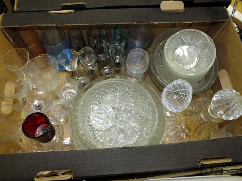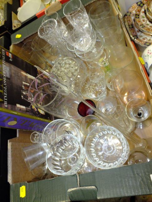 THREE TRAYS OF GLASSWARE AND CRYSTAL ITEMS TO INCLUDE A PAIR OF WATERFORD VASES
