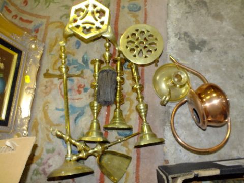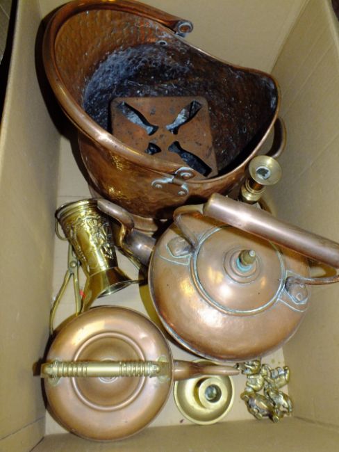 A COPPER AND BRASS TO INCLUDE KETTLES, COAL SCUTTLE ETC.
