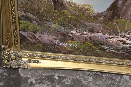 A LARGE GILT FRAMED OIL ON CANVAS OF A WOODEN RIVER SCENE SIGNED I CAFIERI LOWER LEFT - OVERALL SIZE 69CM X 100CM