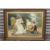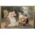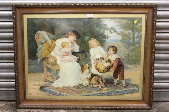 A LARGE FRAMED AND GLAZED CLASSIC VICTORIAN SCENE PRINT OF A FAMILY SCENE WITH PUPPIES IN A BASKET - OVERALL SIZE 72.5CM X 95CM