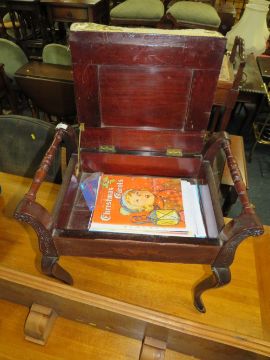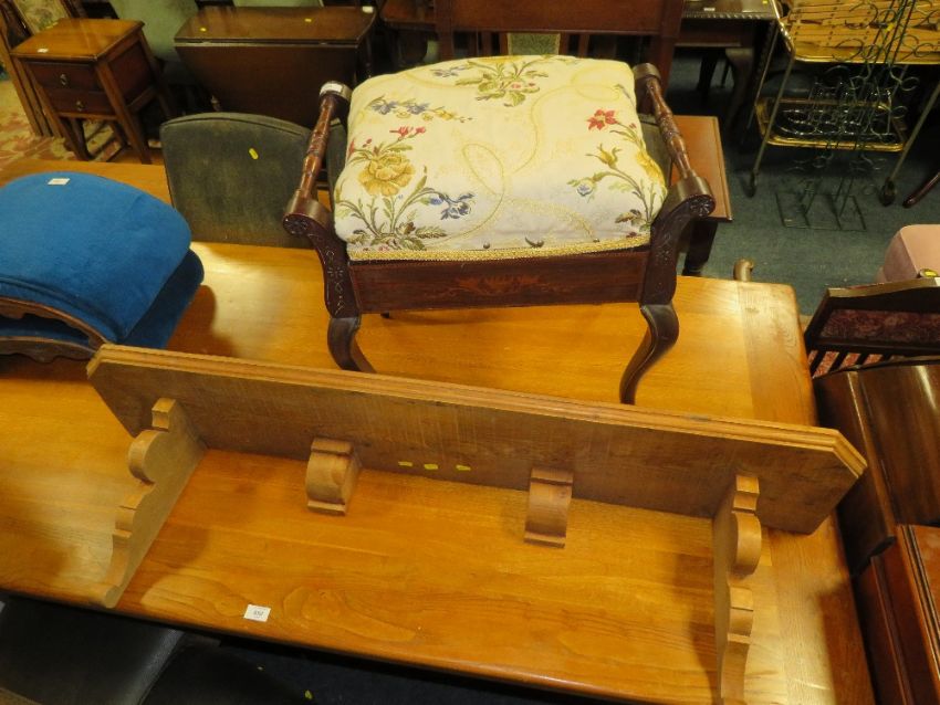 AN EDWARDIAN INLAID PIANO STOOL TOGETHER WITH A HEAVY PINE SHELF L-126 CM (2)