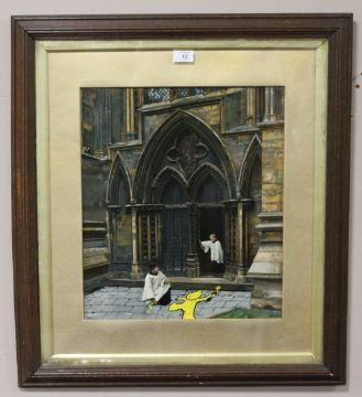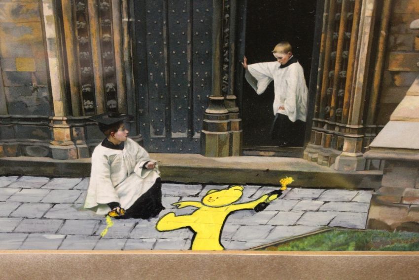 MODIFIED ART IN THE STYLE OF BANKSY, MADE FROM AN ORIGINAL FRAMED PRINT DEPICTING CHOIR BOYS ON THE STEPS OF A CATHEDRAL, with later addition of a 'Mild Mild West' bear as if one boy is spraying street art while the other looks on, 45 x 39 cm